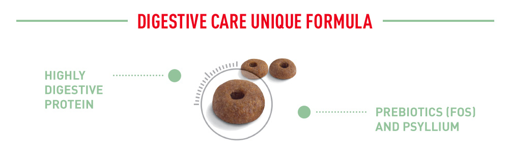 Formula ROYAL CANIN® Digestive Care mengandung protein berdaya cerna tinggi (L.I.P.) membantu memudahkan pencernaan untuk kucing anda, yang sangat membantu untuk kesehatan keseluruhan yang baik. ROYAL CANIN® Digestive Care juga mengandung perpaduan prebiotik dan serat khusus (termasuk psyllium) membantu mendukung keseimbangan flora usus dan mengatur transit usus. Jumlah protein yang terkandung sangat tinggi dan berkualitas tinggi untuk membantu memelihara kekuatan otot internal di seluruh tubuh kucing anda dan menjaga kualitas kotorannya secara konsisten, yang juga membantu mengatur dan mengurangi waktu buang airnya. Juga ditambahkan kandungan lemak, juga beberapa jenis vitamin dan mineral, untuk melengkapi keseimbangan nutrisi makanan yang optimal untuk kucing anda. Lebih lagi, ROYAL CANIN® Digestive Care mendukung pencernaan yang sehat dengan kibble berbentuk cincin yang secara alamiah memperlambat proses makan dan pengunyahan, meminimalisir risiko gangguan pencernaan. ROYAL CANIN® Digestive Care telah mendapatkan hasil pembuktian secara klinis: penggunaan khusus dari ROYAL CANIN® Digestive Care efektif setelah 10 hari saja – menghasilkan produksi kotoran yang lebih rendah sebesar 49% berkat konsumsi dan penyerapan nutrien yang dioptimalkan.