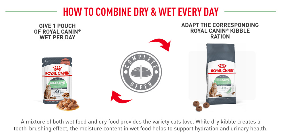 Untuk memenuhi pilihan individu masing-masing kucing, ROYAL CANIN® Digestive Care juga tersedia dalam makanan basah dalam kaldu yang lezat. Jika anda mempertimbangkan untuk memberikan makanan campuran, mudahnya ikuti panduan pemberian makanan kami untuk memastikan kucing anda mendapatkan jumlah yang akurat dari makanan basah dan kering untuk manfaat yang optimal.