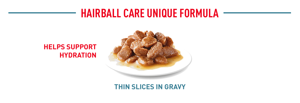 ROYAL CANIN® Hairball Care in Gravy wet cat food diformulasikan untuk membantu kucing anda mengeluarkan rambut yang tertelan dengan merangsang transit usus – mengeluarkan rambut tertelan yang biasanya akan tetap berada di perut. Formula ini juga membantu memelihara berat badan ideal kucing anda – dengan kandungan lemak rendah hanya 2.7%. Asam lemak esensial ditambahkan untuk membantu menyediakan energi yang berarti. Daya cerna tinggi didukung melalui penambahan serat makanan di ROYAL CANIN® Hairball Care in Gravy, menciptakan flora usus yang seimbang dan aktivitas usus yang sehat.