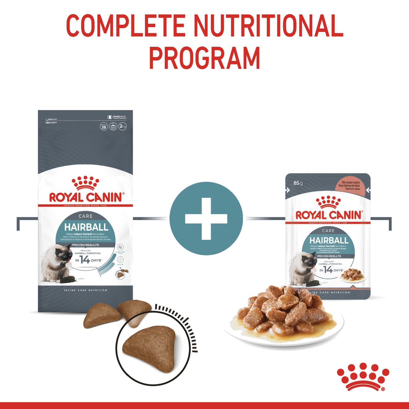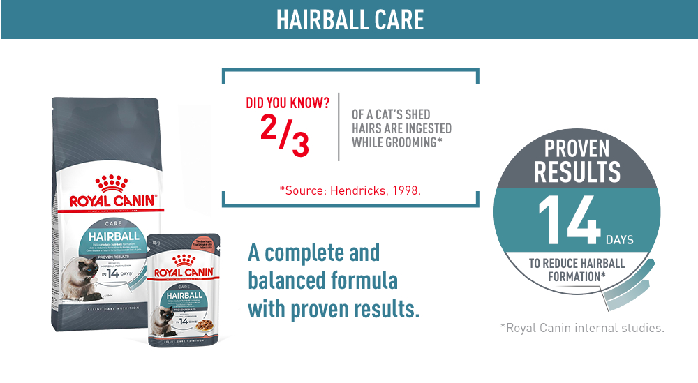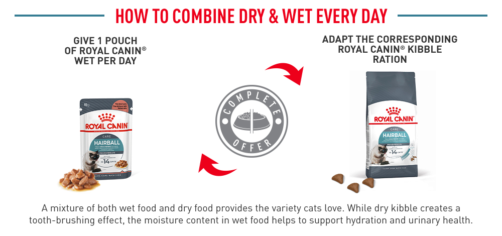 Untuk memenuhi pilihan individu masing-masing kucing, ROYAL CANIN® Hairball Care juga tersedia dalam makanan kering, dengan kibble yang renyah dan lezat. Jika anda mempertimbangkan untuk memberikan makanan campuran, mudahnya ikuti panduan pemberian makanan kami untuk memastikan kucing anda mendapatkan jumlah yang akurat dari makanan basah dan kering untuk manfaat yang optimal.