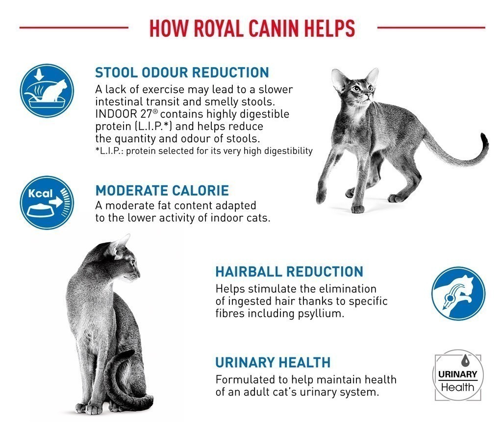 Kurangnya aktivitas fisik mungkin mengakibatkan transit usus yang lebih lambat yang dapat mengakibatkan kotoran yang bau. Indoor 27 mengandung protein berdaya cerna tinggi (L.I.P.*), kandungan serat yang sesuai dan nutrien khusus untuk meningkatkan pencernaan yang baik dan membantu mengurangi kuantitas dan bau kotoran. *L.I.P.: protein pilihan dengan daya cerna sangat tinggi.