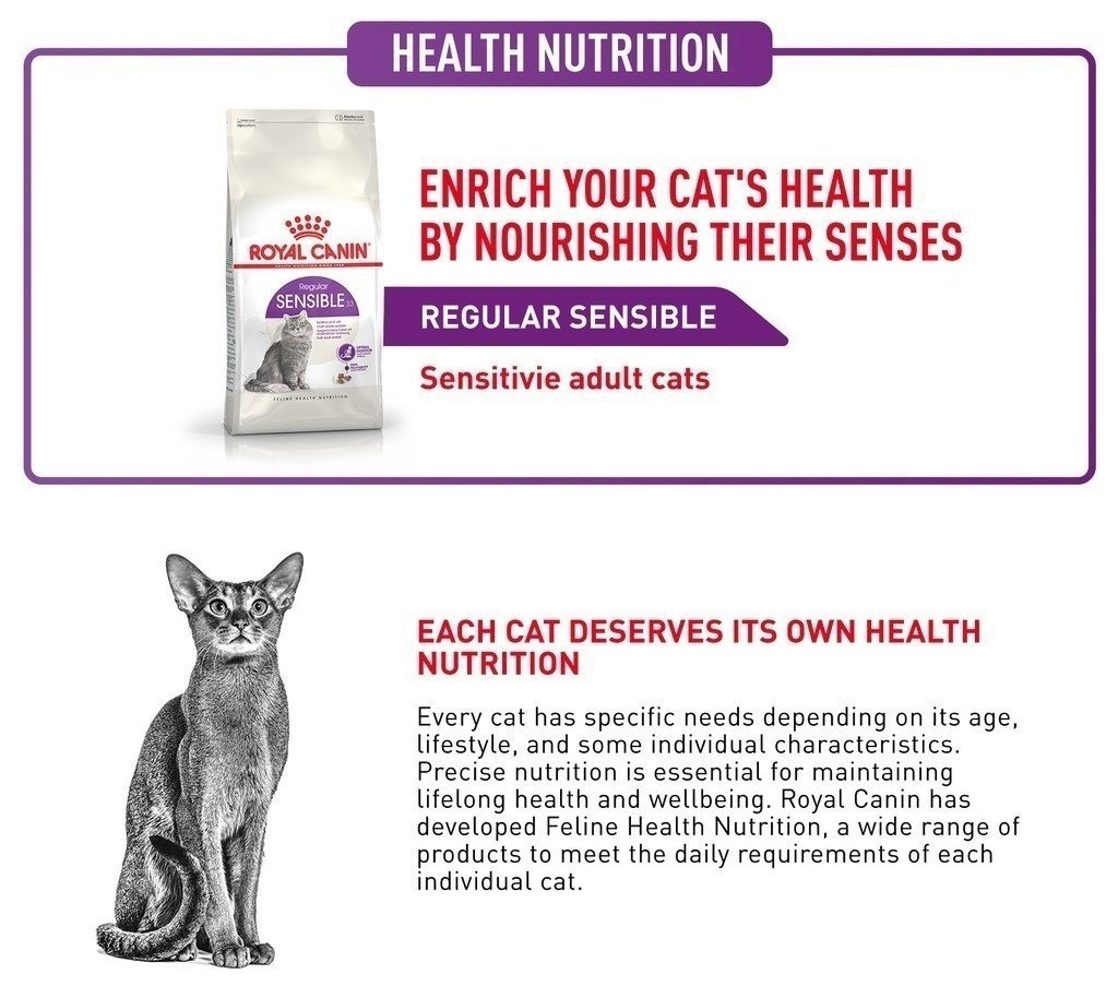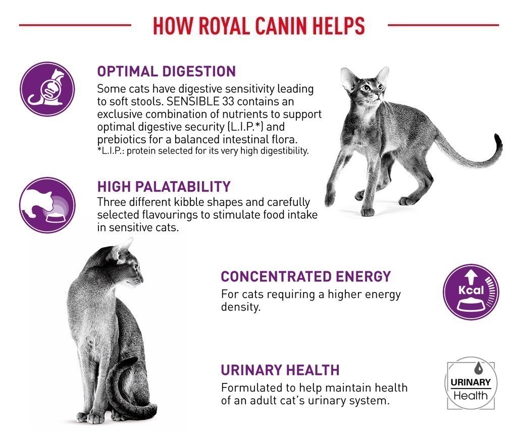Beberapa sistem pencernaan kucing sensitif terhadap beberapa jenis makanan, jika ini terjadi pada kucing anda maka perubahan di dalam makanannya mungkin diperlukan untuk menyesuaikan perutnya. Ada banyak nutrien yang kemungkinan memiliki efek menenangkan untuk sistem pencernaan kucing anda. Cocok untuk kucing dewasa usia 1-7 tahun, ROYAL CANIN® Sensible 33 dry cat food diformulasikan khusus untuk mendukung kucing dewasa yang menunjukkan tanda sensitivitas ke makanan tertentu. Ini mengandung perpaduan khusus nutrien untuk memperkuat dan mendukung keamanan pencernaan yang optimal.